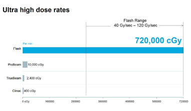 在2018年10月北美放射腫瘤學會年會上,瓦里安宣布了具有“諾貝爾獎”意義的超高劑量極速癌癥治療方法——“Flash”。這將是革命性的最新粒子治療方法。Flash 療法是一種非侵入性治療,以極高的劑量及劑量率(72萬cGy/分鐘)在極短的時間里(1秒內)對人體癌癥部位釋放質子束流。在一次照射后,癌癥細胞能就被摧毀而正常細胞損害顯著降低。目前已經基本完成動物試驗,不久將進入臨床試驗階段。