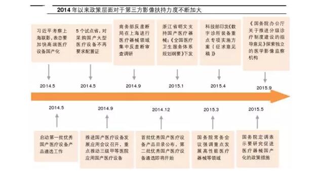 國(guó)內(nèi)的醫(yī)學(xué)影像中心復(fù)制了這種模式,但初期受限于人才引進(jìn)難、資金籌集少、隱形歧視和政策限制等原因,彼時(shí)獨(dú)立醫(yī)學(xué)影像中心在國(guó)內(nèi)發(fā)展緩慢。2016年8月,衛(wèi)計(jì)委發(fā)布《醫(yī)學(xué)影像診斷中心基本標(biāo)準(zhǔn)和管理規(guī)范(試行)》,首次明確了第三方醫(yī)學(xué)影像診斷中心獨(dú)立法人地位,其后隨著“十三五”醫(yī)改規(guī)劃中“加快社會(huì)辦醫(yī)”的內(nèi)容推出和醫(yī)療改革的不斷推進(jìn),行業(yè)終于迎來(lái)轉(zhuǎn)機(jī)。