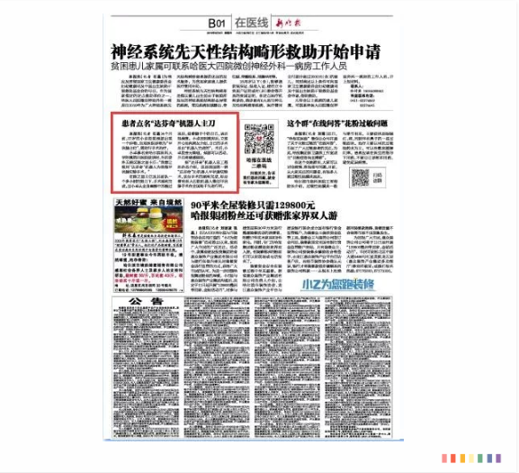 據《新晚報》2019年8月8日第B01版報道,27歲的患者小卓(化名)發現頸部有腫物,當地醫院診斷為“甲狀腺占位”,需進行手術治療。該患者來到哈爾濱醫科大學附屬第四醫院就診點名希望使用達芬奇機器人進行甲狀腺切除手術。在主任陳之顯及其團隊一個多小時的努力下,手術順利完成。這是我國首例“達芬奇”Xi機器人甲狀腺切除術,這臺手術的順利完成,標志著哈醫大四院機器人微創甲狀腺手術在全國處于先進行列。