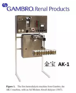 動靜脈shunt的發(fā)明,自體動靜脈內瘺成形術的成功,給慢性腎衰患者的治療帶來了新的福音,讓透析變?yōu)榭赡堋M肝鲈O備所蘊含的巨大商業(yè)價值也立刻被嗅覺敏銳的商人運用起來,下圖為金寶和百特各自推出的第一代透析機,如今金寶已被百特并購。