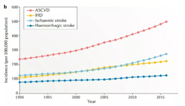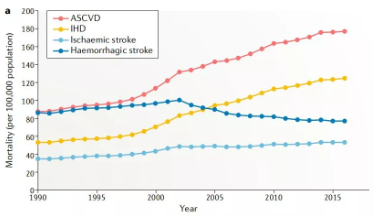 腦卒中、冠心病等心血管疾病(Cardiovascular disease,CVD)是造成我國居民死亡和疾病負擔的首要病因,占中國死亡人口的40%,CVD發(fā)病率呈現(xiàn)逐年快速攀升的趨勢,目前我國CVD患者超過 2.9 億例。動脈硬化性心血管疾病(Atherosclerotic cardiovascular disease,ASCVD)是一種單一類型的心血管疾病,包括缺血性卒中(Ischaemic stroke)和缺血性心臟病(Ischaemic heart disease,IHD)。從1990年至2016年,ASCVD的死亡人口增加近100萬,據(jù)統(tǒng)計2016年約有240萬人死于ASCVD,占CVD總死亡人口的61%,占所有死亡的25%。