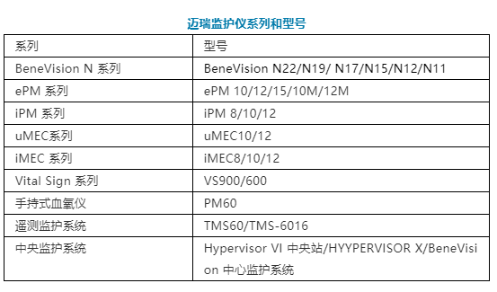 邁瑞的監護儀系列比較多,包括BeneVision N系列、ePM系列、iPM系列、uMEC系列、iMEC系列、Vital Sign系列、遙測系列以及中央監護站和手持式血氧儀。