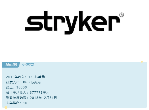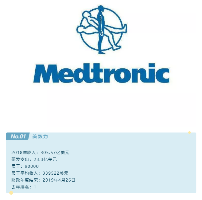 以下是2019年全球十大醫療器械公司名單。值得注意的是,除了排名前三的美敦力、強生、飛利浦、第八的丹納赫,10強的其余排名均發生變化。