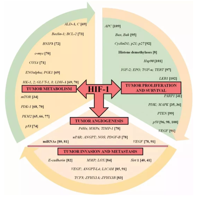 由于HIF-1調控的基因與腫瘤的代謝,增殖、生存和轉移,以及腫瘤血管增生息息相關。因此,抑制HIF-1蛋白和其相關蛋白(HIF-2α)的功能也成了抗癌藥物研發的重要方向之一。