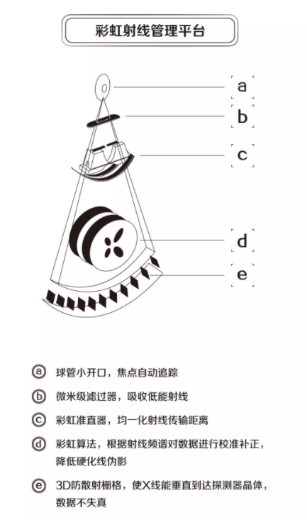 b、動態(tài)三維變焦球管---8MHU飛焦點金屬球管,配合全息微晶元探測器實現(xiàn)221184有效采樣通道,降低偽影,獲得全息高清數(shù)據(jù)影像。