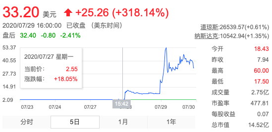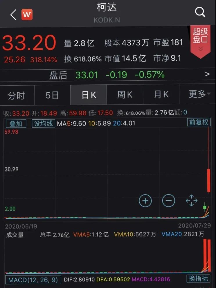 7月29日晚,美股市場上,柯達的股價再度暴漲逾318%,盤中20次觸發熔斷,一度漲至59.98美元的高點,漲超650%,創7年新高。從7月27日開盤2.13美元到29日收盤33.20美元,3天累計上漲1480%,市值暴增13.6億美元。