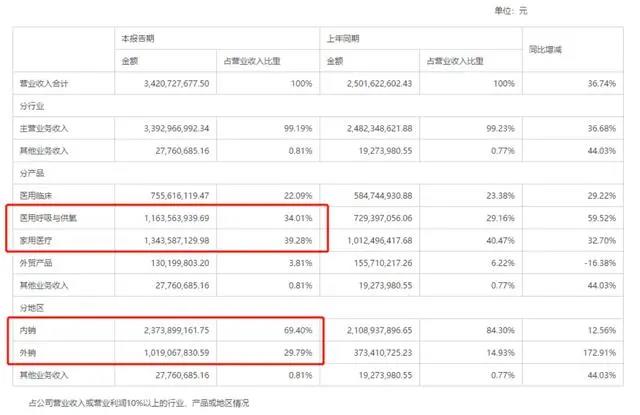 根據半年報,公司產品主要集中在醫用呼吸與供氧、家用醫療等領域,這兩項產品占比超過7成,且業務主要在境內進行。所以真正能夠決定公司未來常態化業績表現的,不是外貿產品,也不是海外訂單。