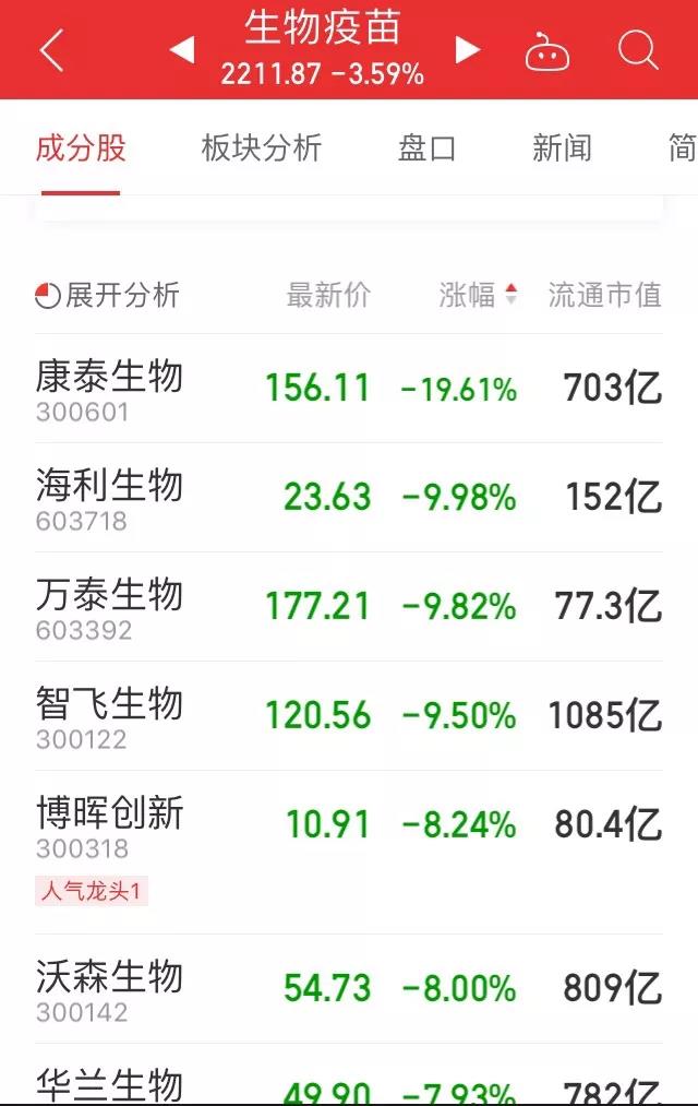受此消息影響,9月9日,A股生物疫苗概念盤中遭遇重挫,截至午盤,康泰生物逼近跌停,成為創業板第一支跌停的股票,海利生物跌停,萬泰生物逼近跌停,智飛生物跌逾9%,沃森生物跌幅超8%,華蘭生物、未名醫藥等跌逾7%,康華生物跌逾6%。