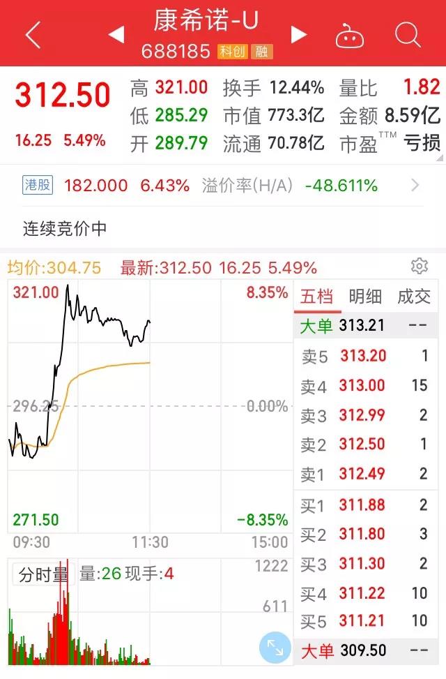 截止午間收盤,康希諾由跌轉漲5.49%,報價312.5元。