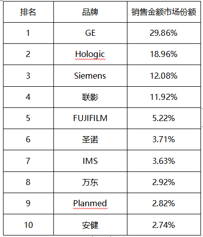 不論從銷售金額和銷售數量來看,GE 和Hologic都名列前茅,可見產品性能深受大家喜歡,銷售數量排名第三的聯影,在銷售額上略偏后于飛利浦。