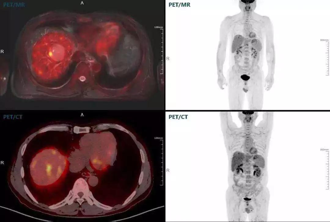 (對于同一例肝臟惡性腫瘤,PET-CT與PET/MR成像對比。可以看到,聯影PET/MR圖像對腫瘤邊界和FDG高濃聚區域清晰顯示。)