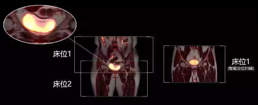 (左圖主要器官分散在兩個床位時的成像,右圖為智能定位能將床位全部置于主要器官中心時成像,避免了由于主要器官分散在兩個床位產生的圖像錯配,也提高了主要器官的PET/MR圖像質量。)