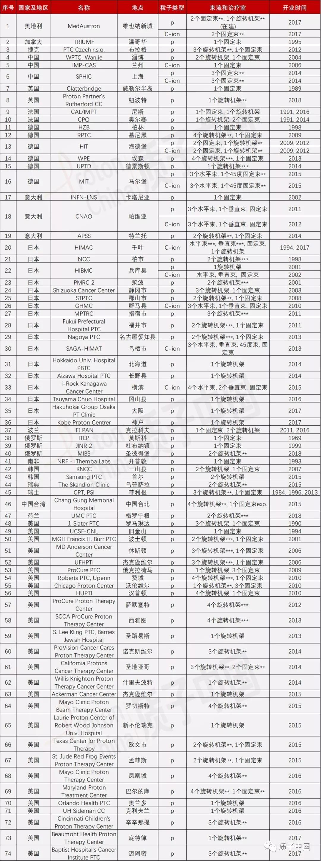 截至2018年7月,根據PTCOG官網統計,全球共有74家已運營的質子重離子治療中心,其中質子治療中心63家,重離子治療中心5家,質子/重離子治療中心6家。