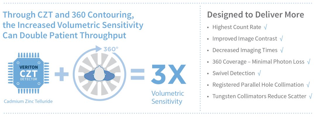 VERITION?系統通過360度輪廓加工大大減少了患者的掃描時間。 通過SPECT或靜態隨訪檢查,與傳統的平面研究同時進行兩次3D SPECT全身骨掃描。CZT探測器具有較高的光子靈敏度,可以減少核MPI研究中的掃描時間和/或減少劑量。除了3倍體積靈敏度與碘化鈉系統相比,還可確保光子捕獲和診斷細節。
