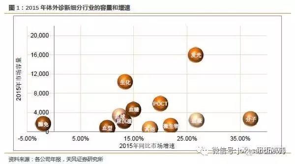 由上圖看出,從市場容量和行業(yè)增速兩個(gè)維度來看,化學(xué)發(fā)光細(xì)分具有良好的投資價(jià)值潛質(zhì)。2015年化學(xué)發(fā)光市場容量160億,占整個(gè)體外診斷行業(yè)30%以上,2015年行業(yè)增速27%,未來3-5年仍具備較高的行業(yè)景氣度。