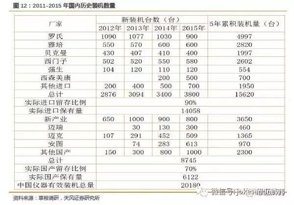 根據(jù)以上邏輯,我們大致可以測算目前的存量市場,發(fā)光還未完全滿足終端需求,2015年儀器保有量來看,只滿足了60%的需求。而未來需求端的增長依然保持極高的增速,除了進(jìn)口企業(yè),少量國產(chǎn)優(yōu)秀品牌可以分享藍(lán)海市場,儀器裝機(jī)依然有很大的空間待開發(fā)。