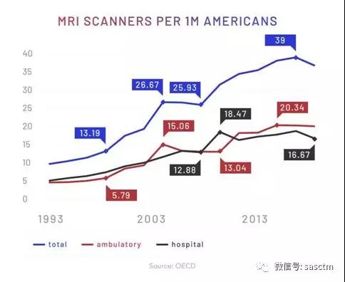 根據經濟合作與發展組織(OECD)的數據:1993年,美國每百萬人的核磁共振掃描儀擁有量不到10臺。2004年,這一數字飆升至27臺;而到2015年,數量已高達39臺。