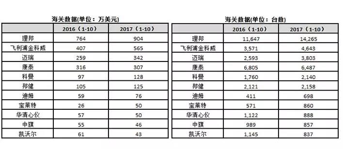 截止2017年10月國內心電廠家出口銷量及銷售額