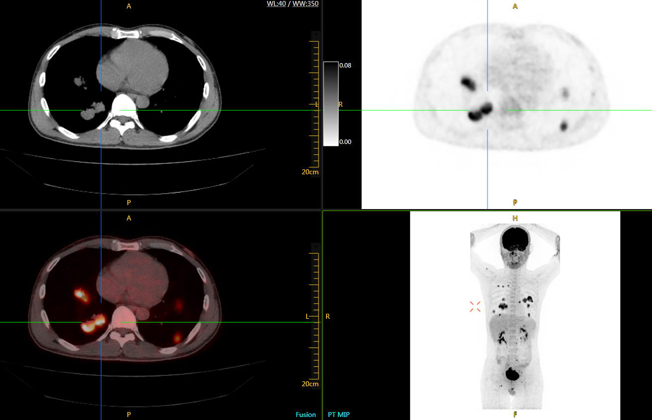患者男性,66歲,七年前發(fā)現(xiàn)右肺肺癌,其間手術(shù)兩次,共切除兩個(gè)肺葉,復(fù)查;
