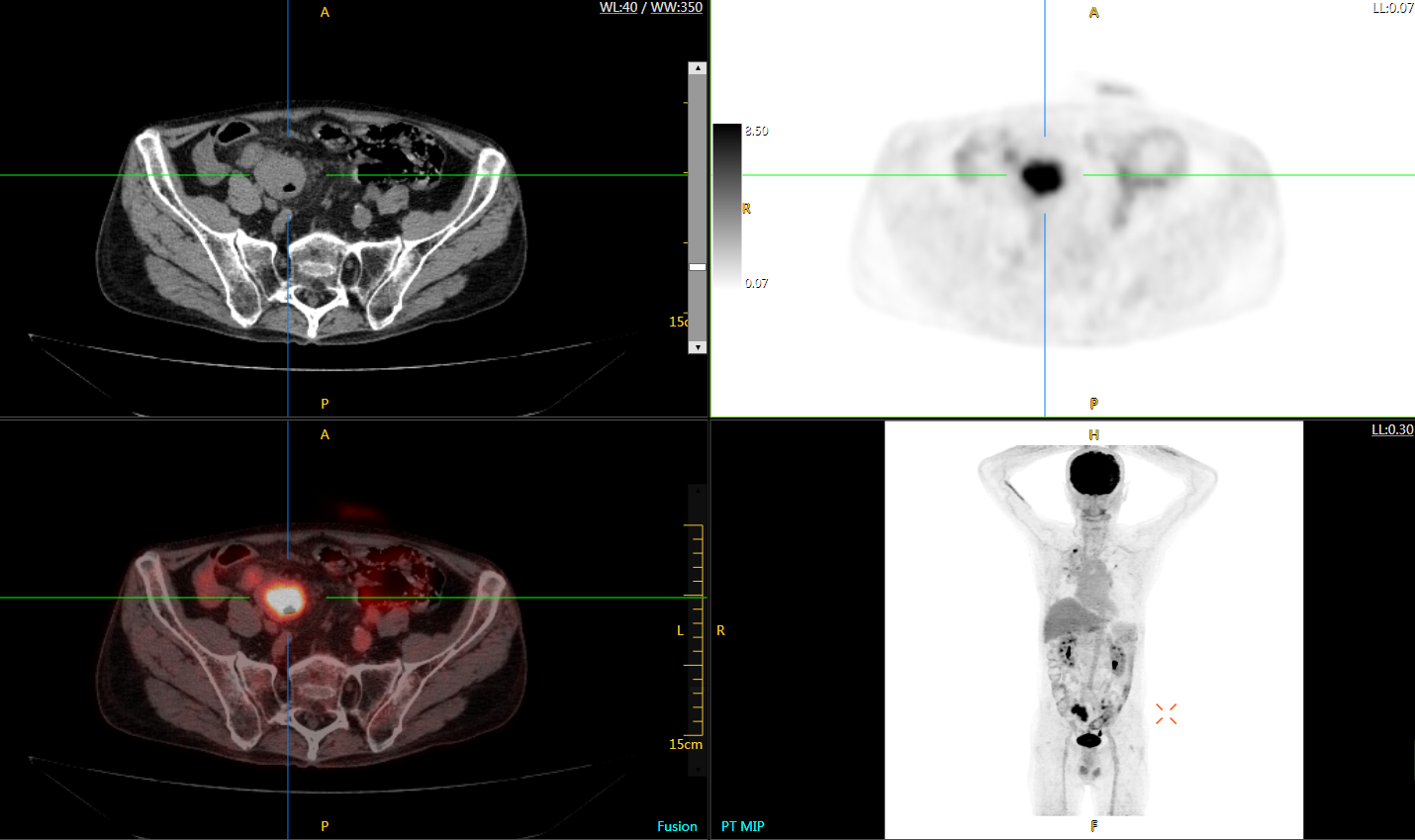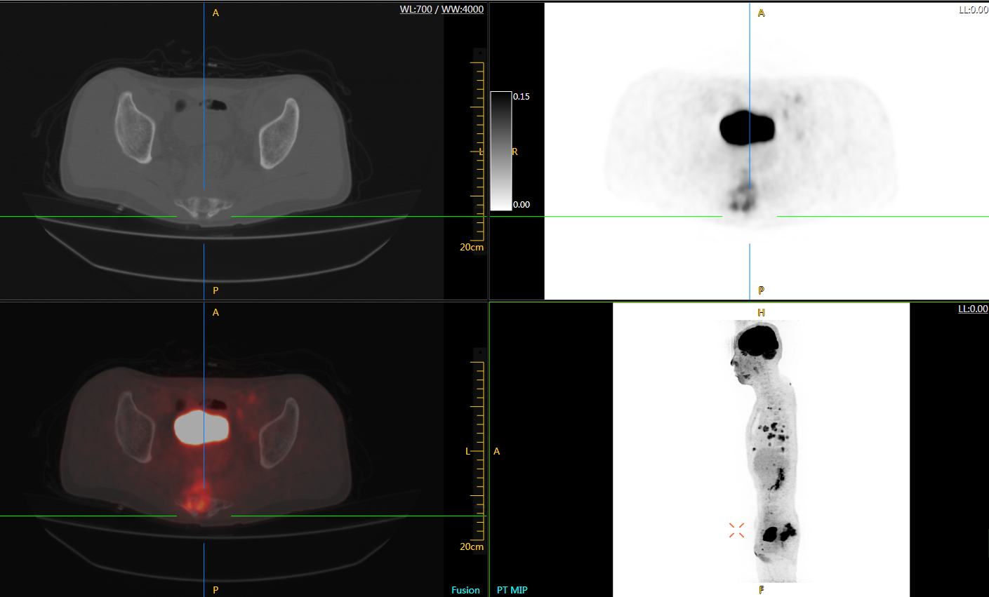 臨床診斷:直腸區(qū)術(shù)后改變,復(fù)發(fā)伴骶骨受累,雙肺多發(fā)轉(zhuǎn)移