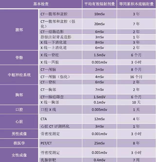 臨床中,常會遇到患者在影像檢查前問醫生,是否有輻射,有多大的輻射呢?下圖是ACR,RSNA等組織聯合制定的常見影像學檢查平均輻射劑量的參考值,或許可以為你更好的回答患者的問題提供借鑒。