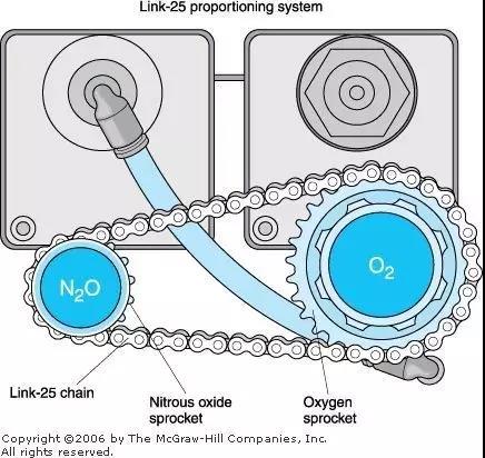 為了防止麻醉機輸出低氧性的氣體,麻醉機還有流量計聯動裝置和氧比例監控裝置,使新鮮氣體出口輸出的最低氧濃度保持在25%左右。采用的是齒輪聯動的原理。在N?O流量計鈕上,倆齒輪之間用鏈條連接,O?旋轉一圈,N?O旋轉兩圈。當單獨旋開O?流量計針型閥時,N?O流量計保持不動;當旋開N?O流量計時,O?流量計隨之聯動;兩個流量計均打開時,逐漸關閉O?流量計,N?O流量計也隨之聯動下降。