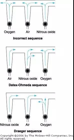 另外,不知道大家有沒有觀察過流量計的順序問題,其實這也有講究。也就是把氧流量計安裝在最靠近共同出口處,萬一在氧上風位發生的漏口,這樣流失的大部分是N?O或者空氣,O?損失最少。當然,它的順序也不能保證不發生因流量計破裂所致的低氧。