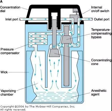 蒸發器是一種能將液態的揮發性麻醉藥轉變成蒸汽,并按一定量輸入麻醉環路的裝置。各種蒸發器型號及各特點不少,但總體的設計原理如圖。