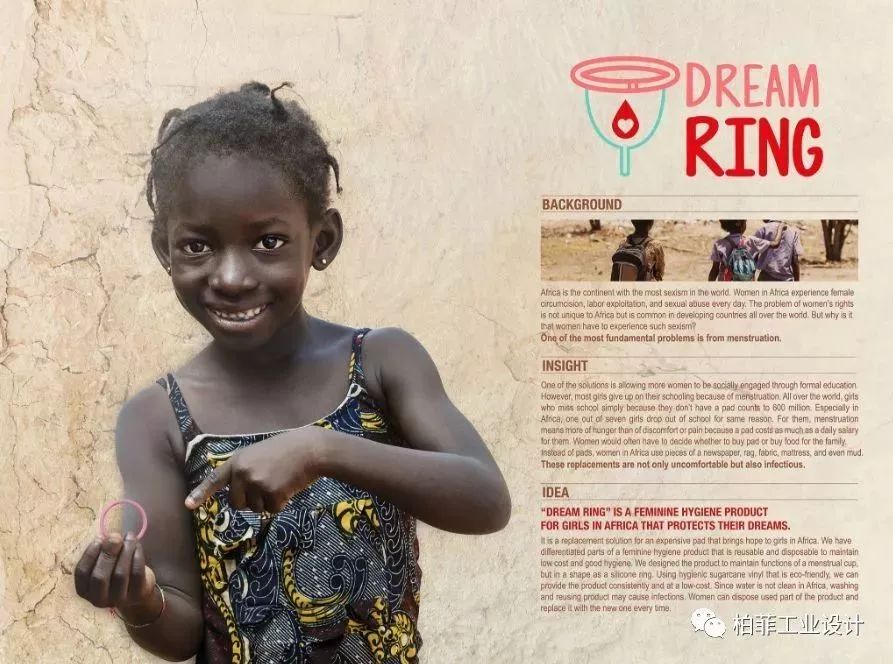 設計說明:非洲婦女每天都會經歷性別偏見和歧視,而針對這個問題所提出的解決方案是讓更多的女性參與正規教育。無法取得便宜且衛生的女性衛生用品是許多非洲女孩放棄上學的主要原因之一。一片衛生棉可能會花掉一天的工資,迫使婦女在經期來時會使用報紙、破布、布料甚至泥土。DREAM RING是一款便宜又環保的女性衛生用品,由矽膠環和甘蔗乙烯制成。可重復使用的矽膠環和拋棄式的甘蔗乙烯是DREAM RING既經濟又安全的關鍵因素。