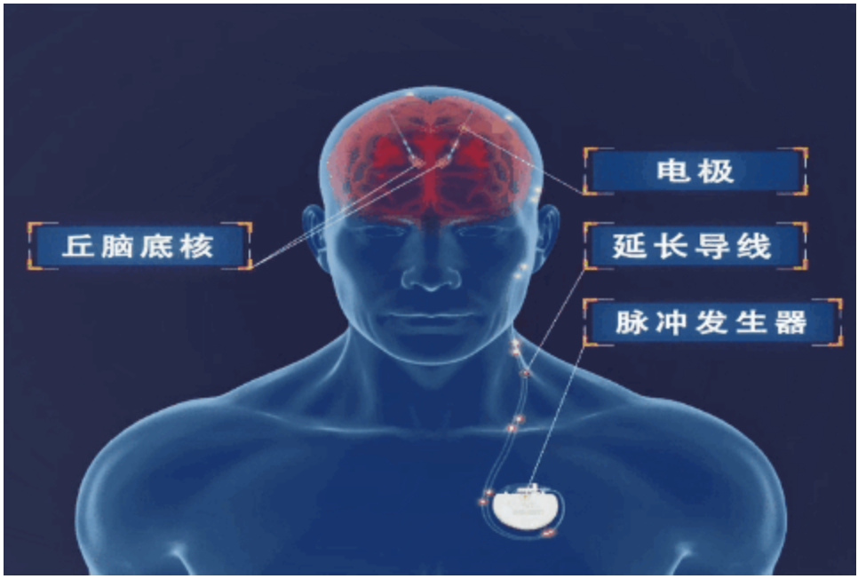 腦起搏器是腦深部電刺激療法(DBS)的俗稱,這種直接作用于神經中樞的人工裝置,通過埋植于胸前的脈沖發生器向植入在大腦特定靶點的電極發放弱電脈沖,刺激腦內控制運動的相關神經核團,抑制引起帕金森病癥狀的異常腦神經信號。從而消除因帕金森病導致的運動失能,并減輕服用藥物產生的運動癥狀波動和異動,成為藥物“蜜月期”結束后首選的治療方法。