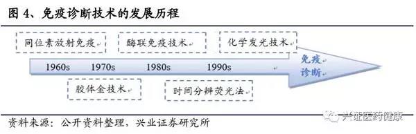 免疫診斷的發展需要依靠免疫學技術的不斷革新,免疫診斷的變革依次經歷了放射免疫檢驗(RIA)、膠體金快速檢驗、酶聯免疫檢驗(ELISA)、時間分辨熒光免疫(TRFIA)的迭代,最終迎來了化學發光免疫檢驗(CLIA)的時代。
