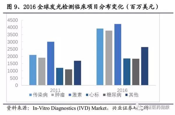 在增速上,全球化學發光檢測表現出穩健的增長勁頭,從2011年到2016年這5年間,各主要檢查項目均保持CAGR10%左右的增速。而國內市場的增速遠遠高于國外,可達30%。其增速來源有二,一是免疫檢測方法的迭代,以前采用手工檢測的Elisa等免疫檢測方法將逐步被化學發光檢測方法替代,二是樣本量的增長,越來越多的項目檢測將被納入化學發光檢測中。