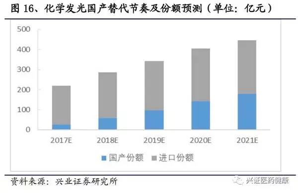 目前,化學發光行業以25%-30%的增速增長,現國內企業已突破技術壁壘,進入銷售放量階段,參考生化替代的節奏,5年內可占有近一半的市場份額。預計在2021年,國內廠家可總共占有百億以上的市場份額。