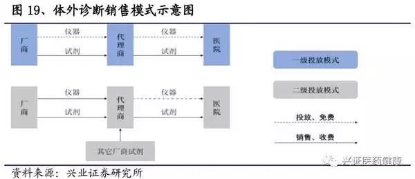 醫院是產業鏈上最強勢的一環,國產產品對醫院的吸引力決定著國產替代進程。在銷售模式上,公司多采用直銷和經銷相結合,以經銷為主。對于醫院終端,儀器基本以投放獲得,廠商以搭配銷售試劑的方式獲得收益。體外檢測等醫療服務由政府統一定價,應用化學發光法可相應提高收費標準(例如:福建省用化學發光法可加價80%)。因此,試劑屬于醫院的“成本項”,醫院有動力對檢測方法進行升級迭代,但卻并沒有動力去特意抬高價格,在相同條件下會考慮試劑性價比,相對市場化。
