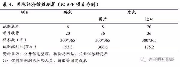 由于儀器是通過投放的形式進駐醫院,從醫院端只需要計算試劑成本。以上測算可得出,此醫院若用發光替代酶免不僅進行了檢驗技術升級,得到優化的檢驗結果,在經濟效益上也更優。在發光項目上,國產對比進口經濟效益明顯,單個項目可得到百來萬的額外收益。