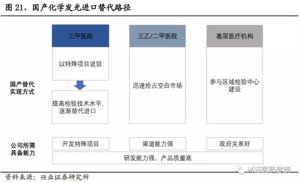 對于三甲醫院,其技術偏好較高,從目前的市場反應來看,國產發光儀器和試劑的精確性和穩定程度仍不能達到三甲醫院的要求。同時三甲醫院多有聲譽追求,對進口品牌的忠誠度高。在價格上,樣本量大、檢驗結果質量要求高、檢驗人員成本高致使其相對價格不敏感。而國內廠家對于試劑的研發仍停留在檢測項目的拓展上,基于現狀,大規模進口替代較難實現。有些特殊項目未涉及,如藥物濃度檢測等,可作為突破口進駐高端醫院,建立品牌形象。總體來說,短期內國內廠商可依靠特殊項目檢查可獲得三級醫院小部分份額,長期來看,想進駐高端醫院并獲得主力項目的份額,須加大研發投入,做好做精發光試劑,打破醫院對于國產山寨的慣性認知。
