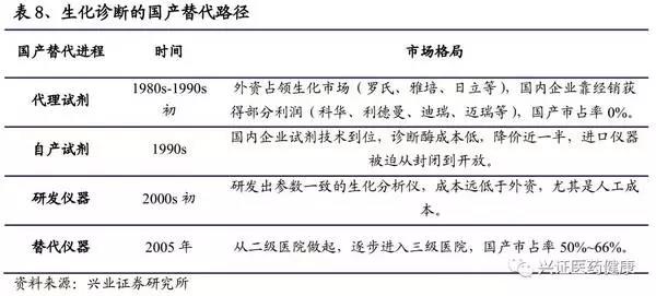 現今,化學發光的發展階段與2000年左右的生化市場相似,回顧生化市場的國產替代進程,可有一定的啟示作用。生化的發展首先從代理國外廠家的試劑開始,逐步自主研發試劑,此時促使國外廠家對其生化系統進行開放。而后逐步研發出生化儀器,對整個生化診斷進行替代。進程如下: