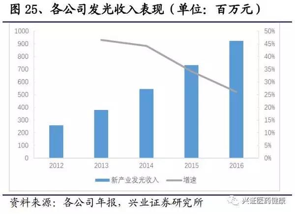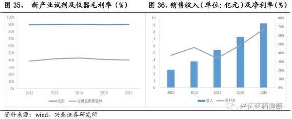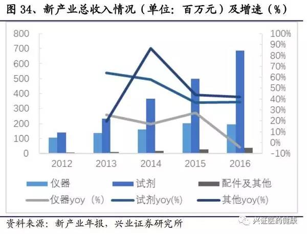 新產業2016年總收入9.23億元,絕大部分為發光產品,2012-2016年,新產業收入復合增速保持在37%左右。其中試劑增速較高,保持在35%以上,隨著儀器投放的增加,試劑的增速將會上升。由于近幾年空白市場將逐漸被消化,儀器的增速將呈現下降的態勢。