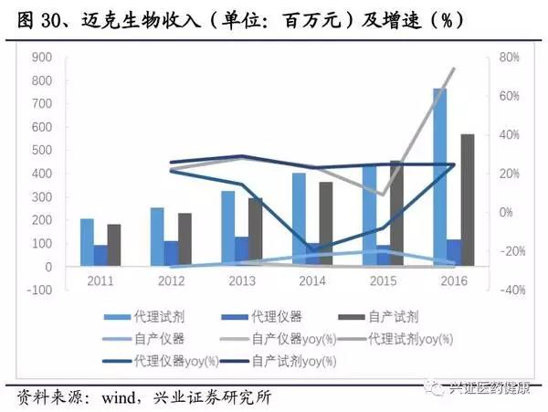 產品線布局全面,放量開啟。邁克早期產品主要是生化試劑,通過代理和自產,公司不斷豐富產品線。從產品布局來看,公司與海外龍頭羅氏、雅培類似,采取全覆蓋戰略。隨著行業的發展,終端對于產品的需求從單產品轉為整體解決方案,產品線延長,保障了未來的增速。短期內,邁克發光的快速增長可以有效帶動收入與利潤的增長,其他細分產品線在2017年以后也即將放量。