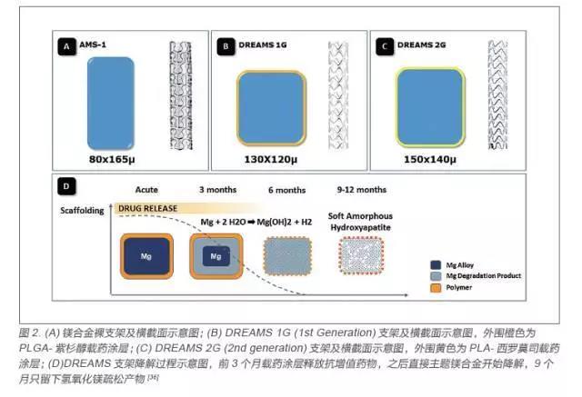 鎂是人體的必需元素,具有多種生理功能,與生命的維持、身體的健康有著極其密切的關系,因此可降解冠脈鎂合金支架研發處于可降解金屬支架的領先水平,以德國Biotronik 公司的鎂合金支架為代表, 前后經歷了AMS、DREAMS 1G(drug-eluting absorbable metal scaffold 1 generation)和DREAMS 2G(drug-eluting absorbable metalscaffold 2 generation)三代支架(圖2),支架基體采用WE43 鎂合金材料[21]。AMS 為鎂合金裸支架,經過PROGRESS 臨床實驗顯示支架具有良好的安全性,且在新生兒體內植入兩個AMS支架后,新生兒血清鎂含量處于正常水平,且不需要進行二次手術,但是降解速度太快徑向支撐力不足導致晚期管腔丟失現象嚴重,因此在該基礎上對鎂合金裸支架的成分和構型進行了更新,加粗了骨架尺寸,添加了一層載有紫杉醇藥物的可降解PLGA 高分子涂層,從而增強了支架支撐力,減少內膜增生以及降低降解速率,研發出了DREAMS 1G[22-24]。