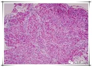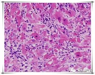 7.100倍還不是看得很清楚,放大400倍就很明顯了,一個個藍點就是淋巴球。這是很厲害的猛暴性心肌炎,整個心臟都被淋巴球浸潤了。