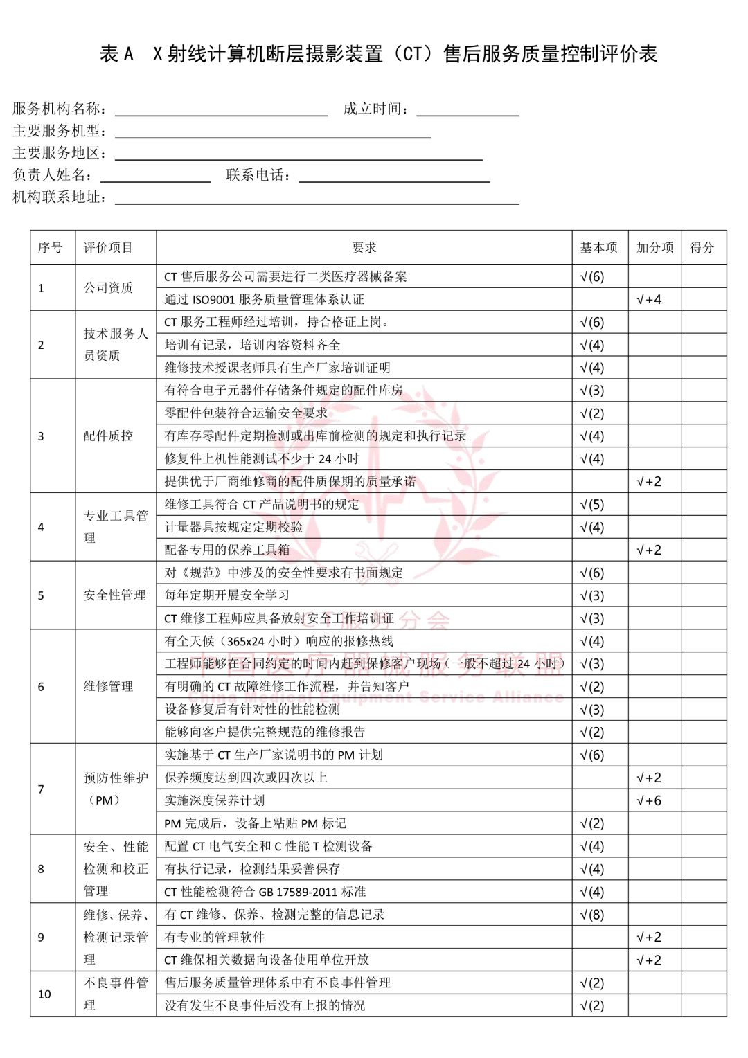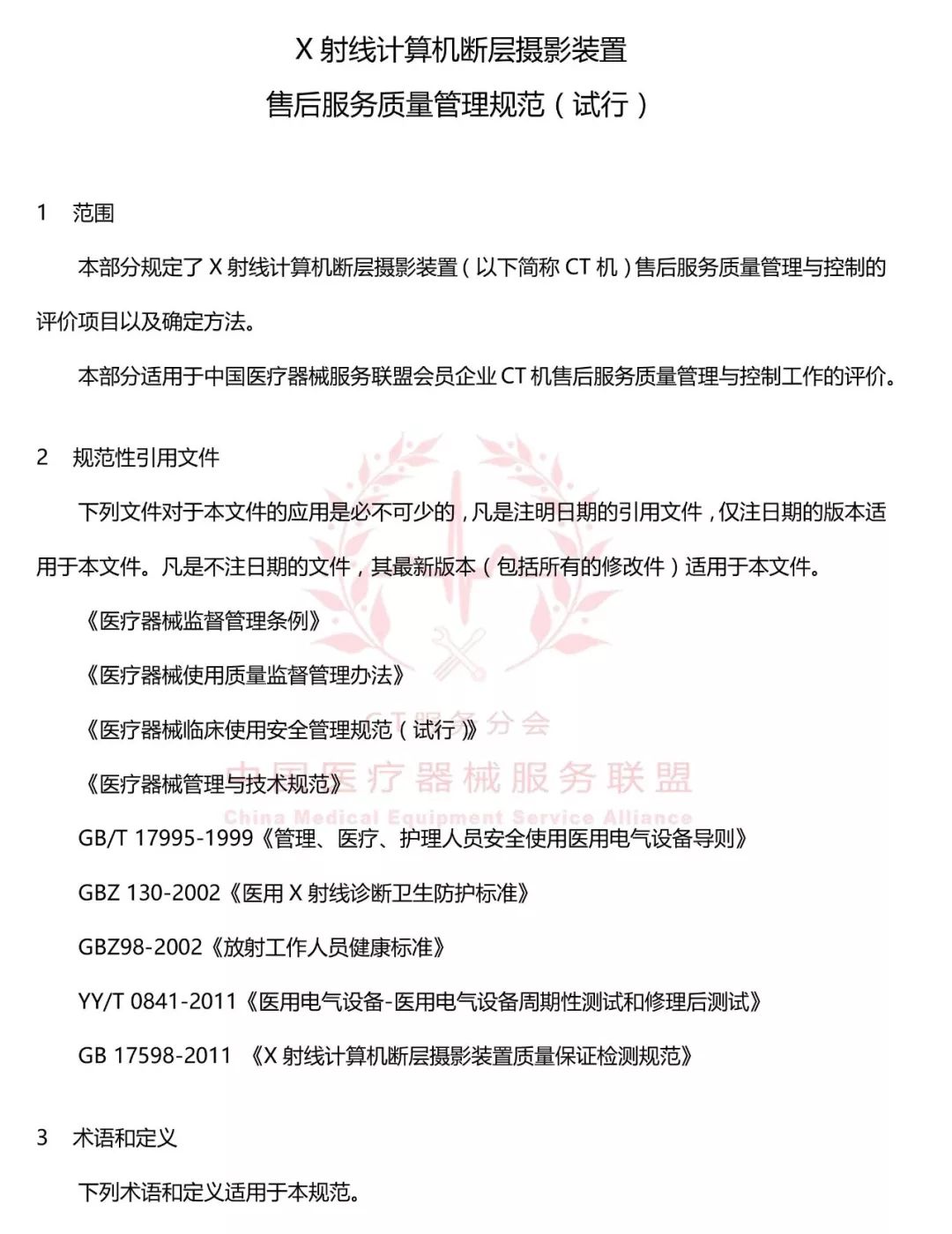 醫療器械售后服務質量管理是醫療器械使用質量管理的重要一環,為加強e中國醫療器械服務聯盟會員企業X射線計算機斷層攝影裝置(CT)售后服務質量管理,貫徹執行《醫療器械監督管理條例》、《醫療器械使用質量監督管理辦法》等規定、標準和規范,進一步提升和統一獨立服務提供商的售后服務水平、保證設備使用質量和安全,提高客戶服務滿意度,制定本規范,作為指導聯盟會員企業在X射線計算機斷層攝影裝置售后服務質量管理和控制工作的評價標準。