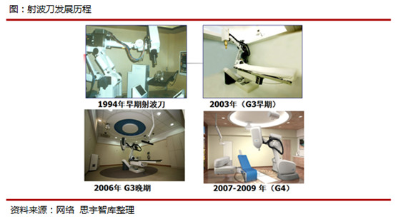 射波刀由斯坦福大學醫療中心腦外科及放射腫瘤學教授的John R. Adler研發。2001年,射波刀獲FDA準許治療身體任何部位的腫瘤。射波刀無須使用金屬頭架或體架,它采用計算機立體定位導航和自動跟蹤靶區技術,是新型的大型立體定向放射治療設備。